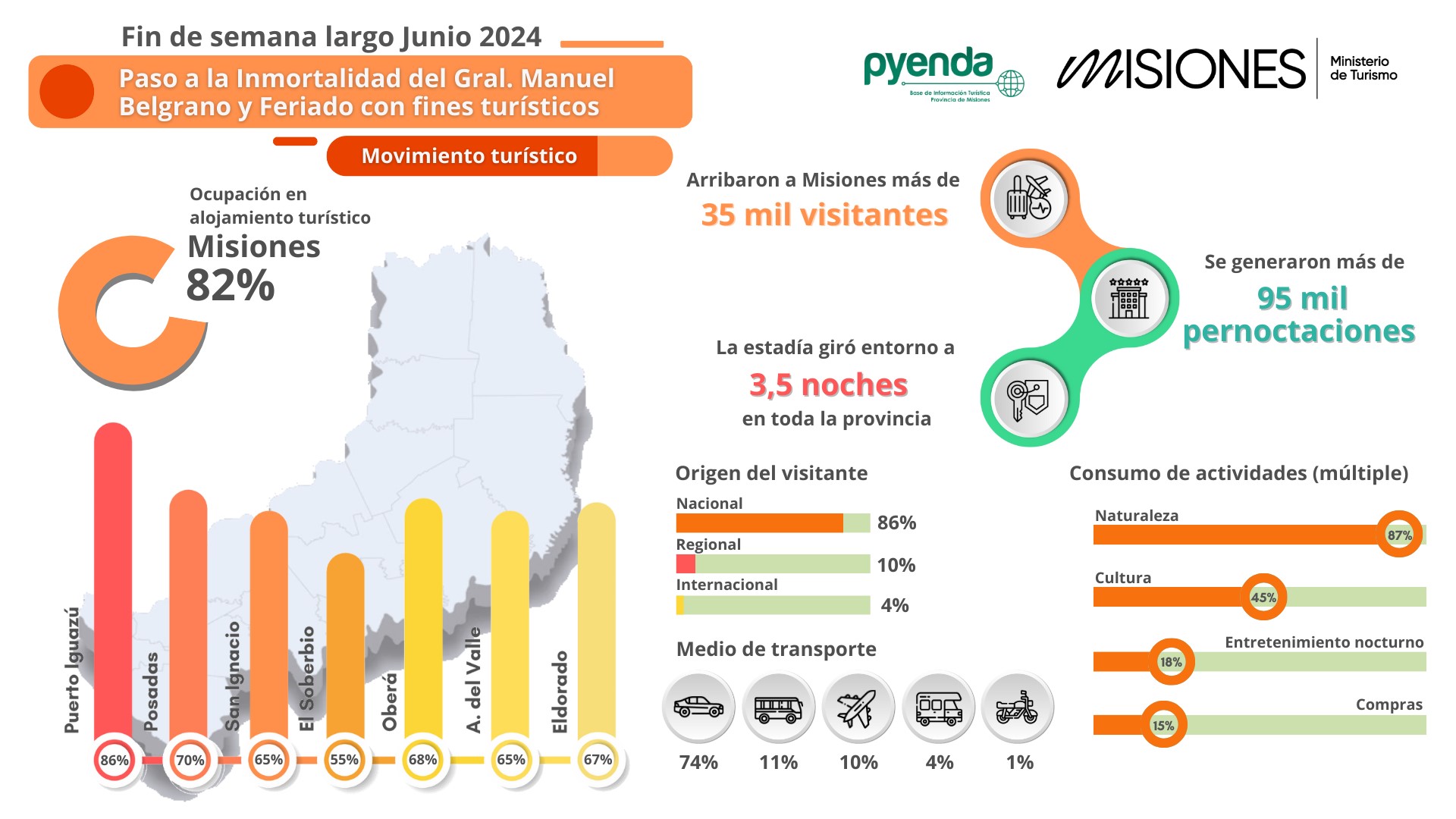 Según datos difundidos por el Ministerio de Turismo de Misiones, más de 35 mil visitantes llegaron a la provincia, generando más de 95 mil pernoctaciones y una estadía promedio de 3,5 noches.