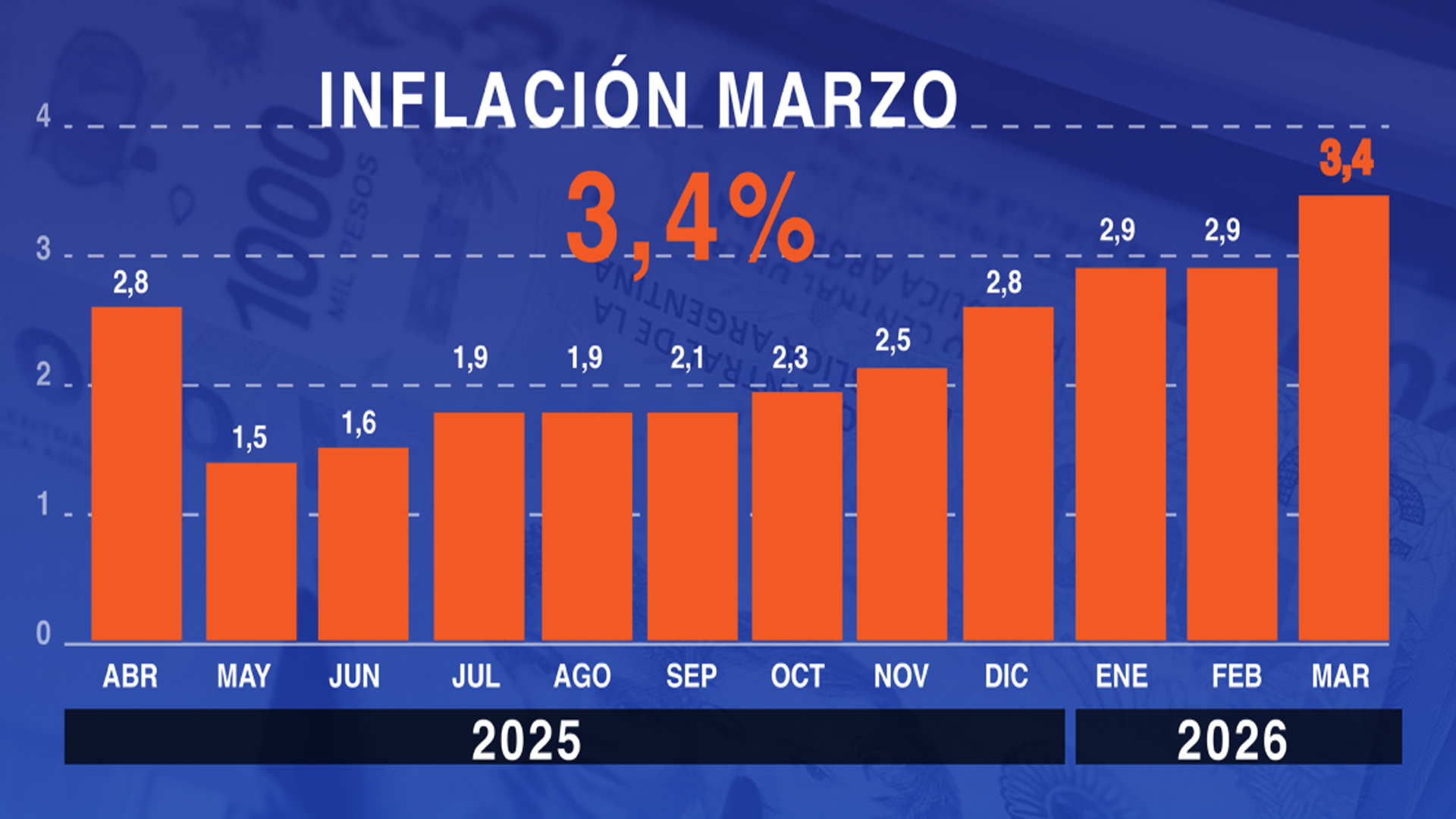 (Infobae). La inflación de marzo alcanzó 3,4%, según el índice publicado por el Instituto Nacional de Estadística y Censos (Indec) lo que implica un incremento de 0,5 puntos porcentuales respecto al 2,9% que marcó en febrero. Se trata de la mayor cifra desde el mismo mes de 2025 cuando arrojó 3,7 por ciento.