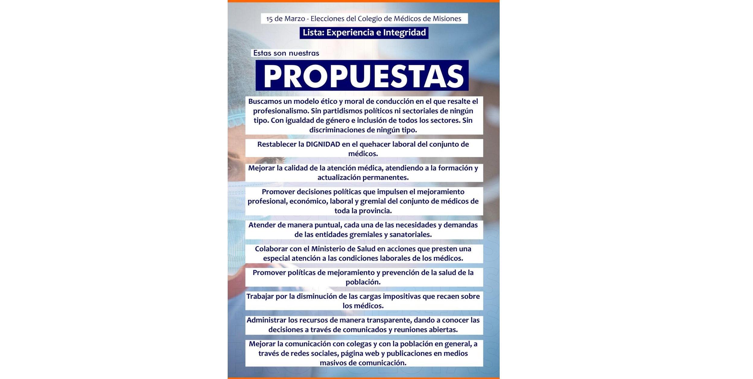 Mañana de 8 a 16 horas se llevarán a cabo las elecciones del Colegio de Médicos de Misiones. La médica, Myriam Cañete, candidata a la presidencia de la comisión directiva, recordó su visión y propuestas para el futuro de la institución e instó a sus colegas a elegir la lista que encabeza: Experiencia e Integridad.