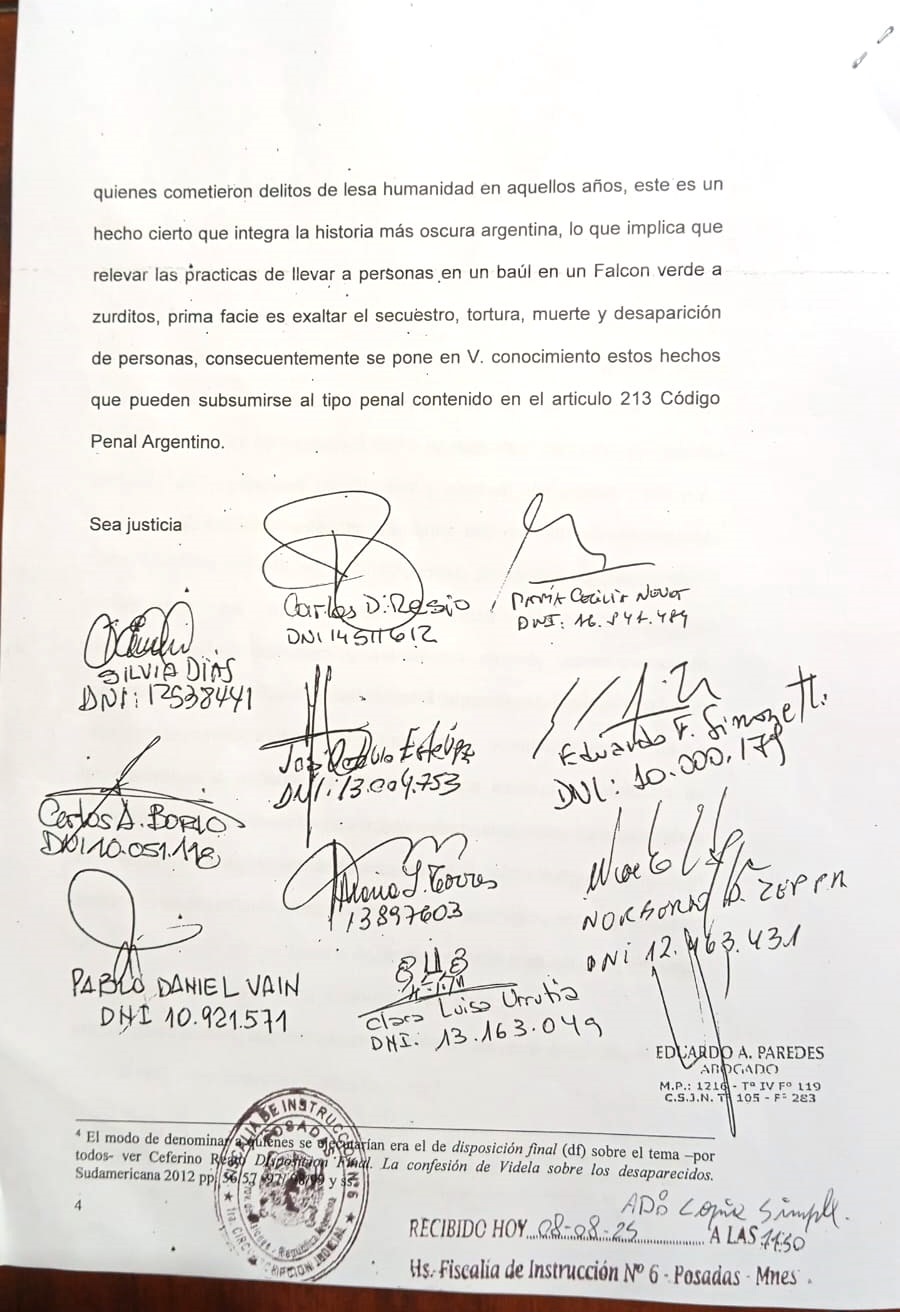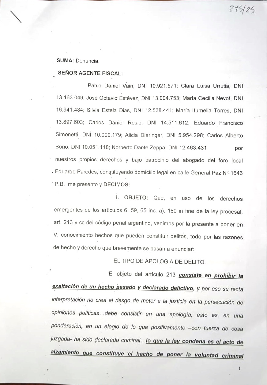 La denuncia penal está suscrita por Pablo Daniel Vain; Clara Luisa Urrutia; José Octavio Estévez; María Cecilia Nevot; Silvia Estela Dias; María Itumelia Torres; Carlos Daniel Resio; Eduardo Francisco Simonetti; Alicia Dieringer; Carlos Alberto Borio y Norberto Dante Zeppa, con el patrocinio del abogado del foro local, Eduardo Paredes.