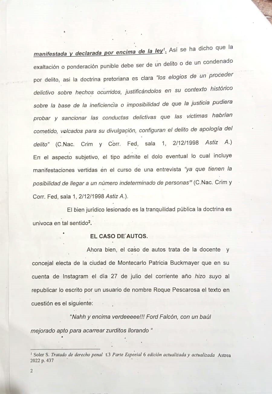 Ahora bien, el caso de autos trata de la docente y concejal electa de la ciudad de Montecarlo Patricia Buckmayer que en su cuenta de Instagram el día 27 de julio del corriente año hizo suyo al republicar lo escrito por un usuario de nombre Roque Pescarosa el texto en cuestión es el siguiente: