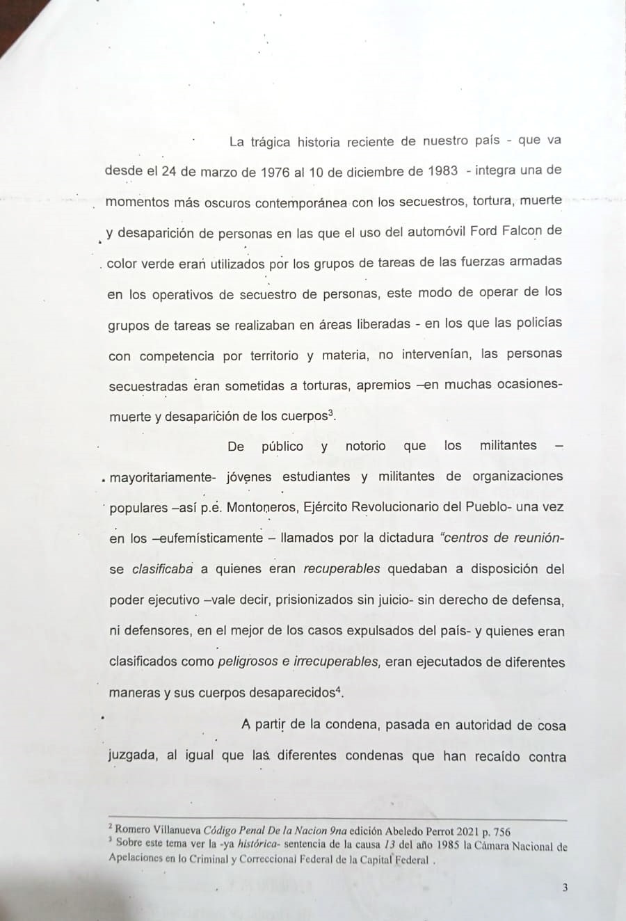 La denuncia tiene citas claves como «Relevar las prácticas de llevar personas en un baúl de Falcon verde es exaltar el secuestro, tortura y desaparición. Esto subsumiría al tipo penal del art. 213».