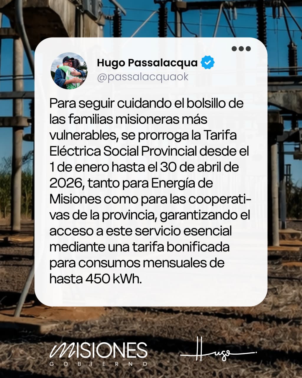 El gobernador de Misiones, Hugo Passalacqua, anunció la prórroga de la Tarifa Eléctrica Social Provincial, que rige desde el 1 de enero y hasta el 30 de abril de 2026. La medida beneficiará a los usuarios residenciales de la empresa estatal Energía de Misiones y de las cooperativas eléctricas de toda la provincia.
