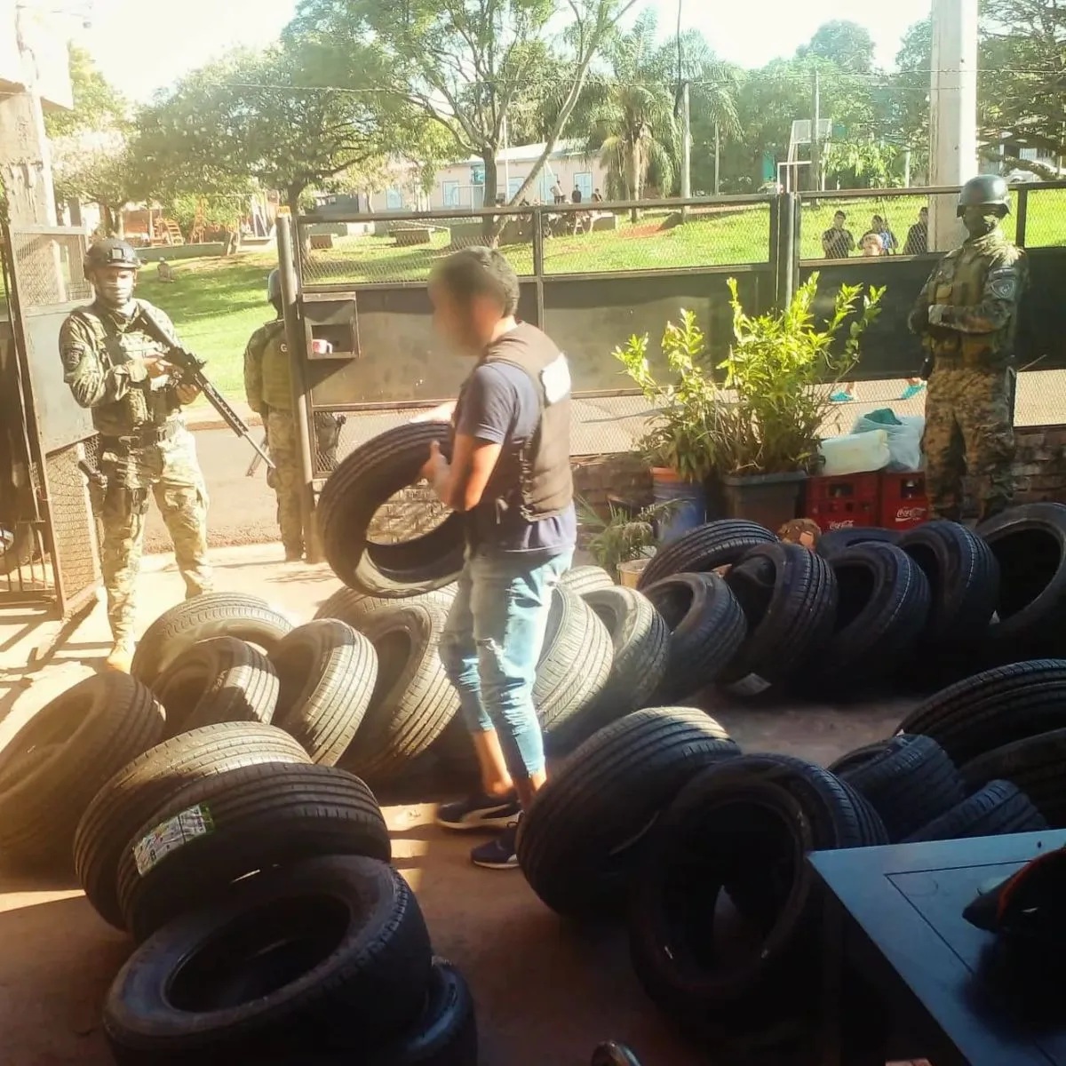 La Policía de Misiones, luego de una exhaustiva investigación que llevó adelante la Unidad Regional X de Posadas, realizó esta tarde un mega allanamiento en una vivienda del barrio Parque Adam, logrando el decomiso de 150 neumáticos de origen extranjero de diversos rodados, valuados en casi 50 millones de pesos.