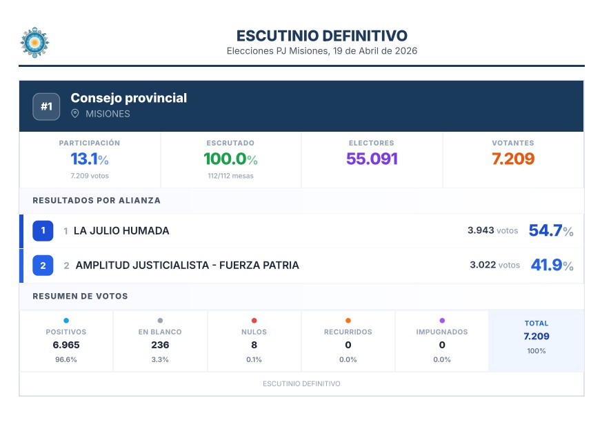El escrutinio definitivo de las elecciones internas del Partido Justicialista (PJ) Distrito Misiones confirmó el triunfo de la lista “La Julio Humada”, encabezada por Christian Ariel Humada, quien asumirá la conducción del justicialismo provincial tras los comicios del domingo 19 de abril en toda la provincia. La nómina ganadora obtuvo 3.943 votos (54,7%) del total, mientras que “Amplitud Justicialista – Fuerza Patria”, liderada por Gonzalo Costa de Arguibel alcanzó 3.022 sufragios (41,9%). La diferencia final fue de 921 votos.