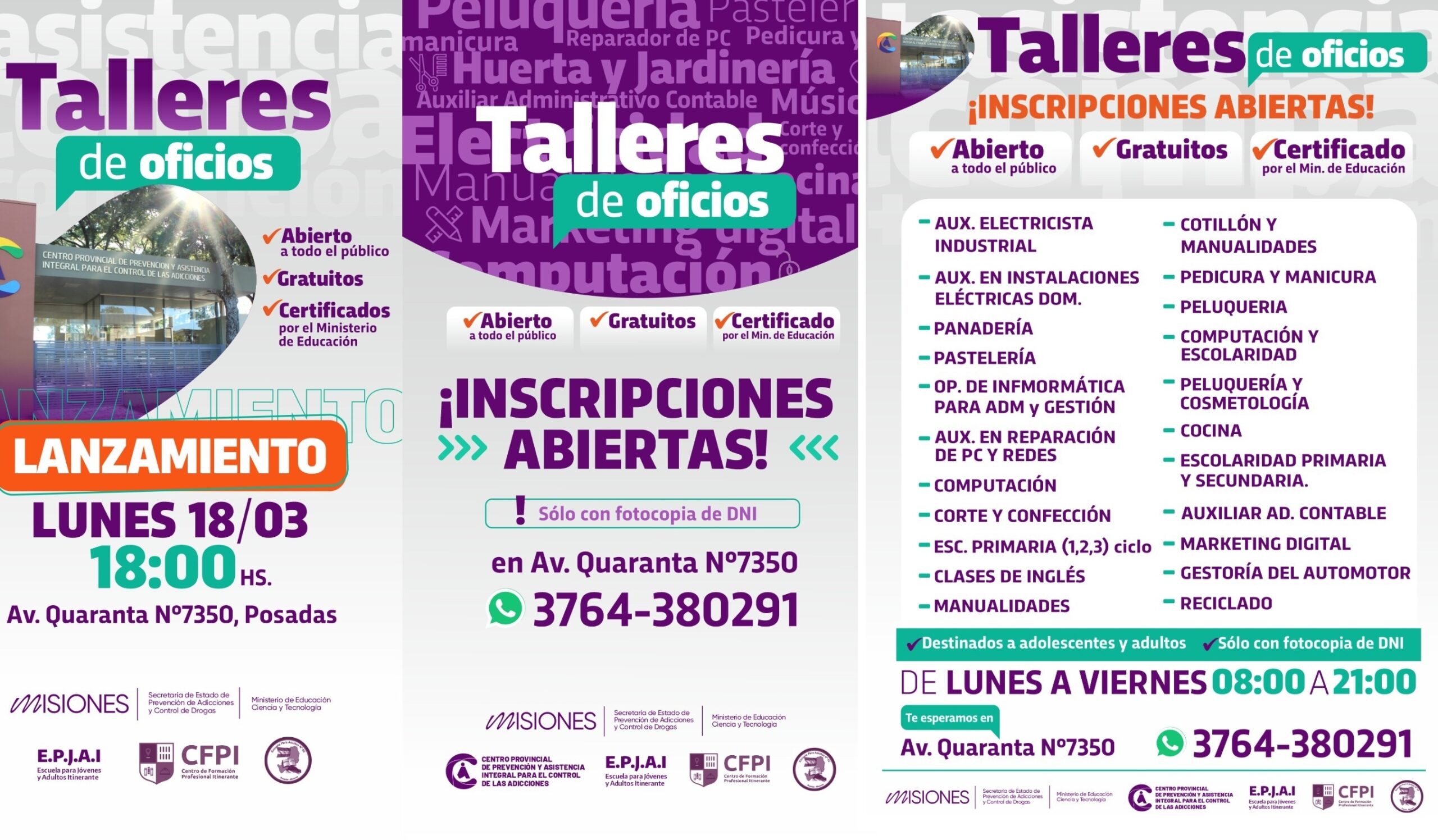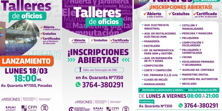 Este lunes 18 de marzo a las 18.00 horas se realizará el lanzamiento y apertura de los talleres de oficios gratuitos que se dictarán en el Centro Provincial de Prevención y Asistencia Integral para el Control de las Adicciones, ubicado en avenida Quaranta 7350.