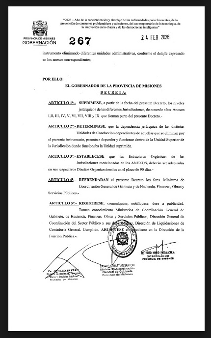 En los fundamentos también se subraya que Misiones mantiene históricamente una de las menores relaciones de empleados públicos por habitante del país. El objetivo, según el texto oficial, es simplificar la estructura de conducción y evitar superposiciones.